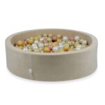 A labdamedence bézs színben, velvet anyagból számtalan boldog, vidám pillanatot és nagyszerű tanulási, fejlődési lehetőséget kínál a gyerekeknek. A színes labdákkal teli labdamedence ösztönzi a kicsiket a mozgásra, ami hozzájárulhat a motorikus képességek fejlesztéséhez.