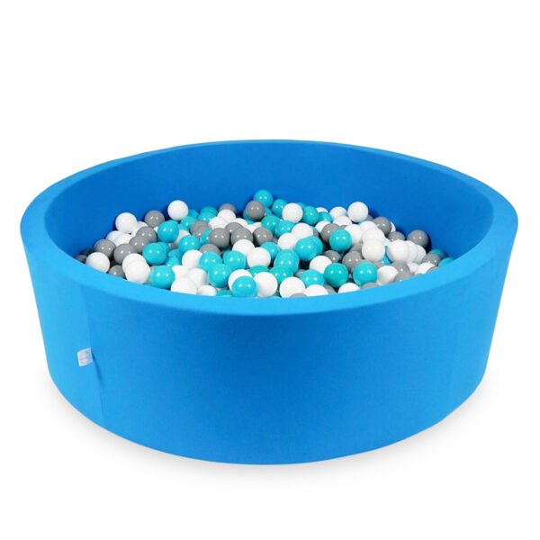 Ez az azúrkék labdamedence élénkebb, játékosabb megjelenést kínál. A türkiz, kék, fehér és szürke labdák dinamikus, mégis harmonikus összhatást adnak. Tökéletes választás aktív gyerekeknek.